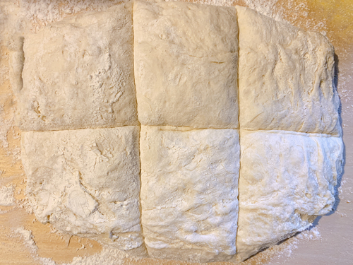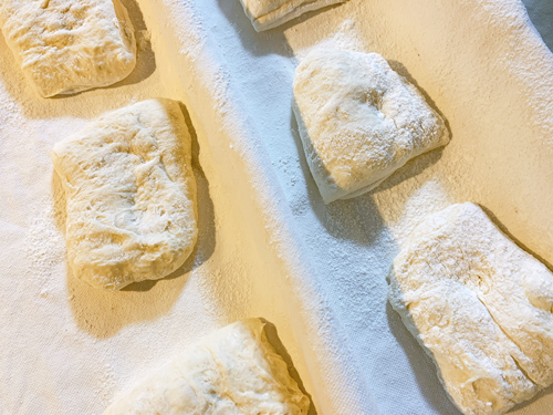 粉を振り、台に生地をあけ、6等分する。生地をやさしくまとめ、粉をたっぷり振ったキャンパス地に並べ上からラップをしてベンチタイム20分。