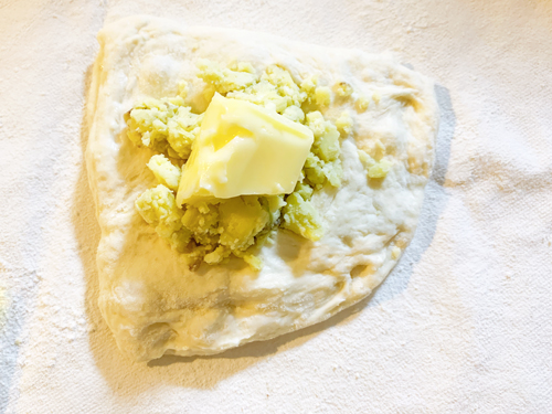 生地を少し平らにして、1/6量のさつまいもとバターをのせ、生地を折りたたんだら、マドレーヌカップに入れる。