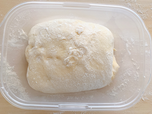 ホームベーカリーにイーストまでの生地の材料を全て入れ、1次発酵まで行う。打ち粉をして、生地を台に出し、三つ折にして密閉容器に入れ、野菜室で1時間ほど休ませる。