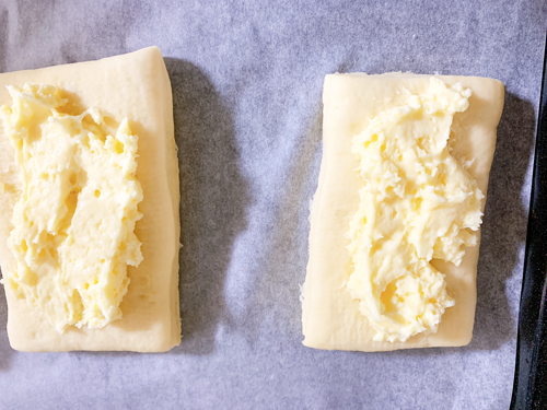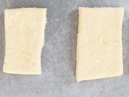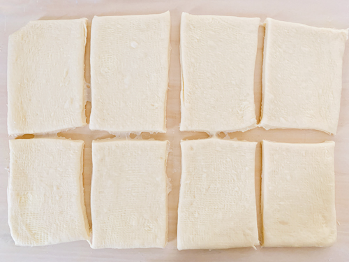 台に打ち粉をして、33cm×22cm程に伸ばして端を1cm切り落とす。8等分に切りオーブンペーパーを敷いた天板に並べる。