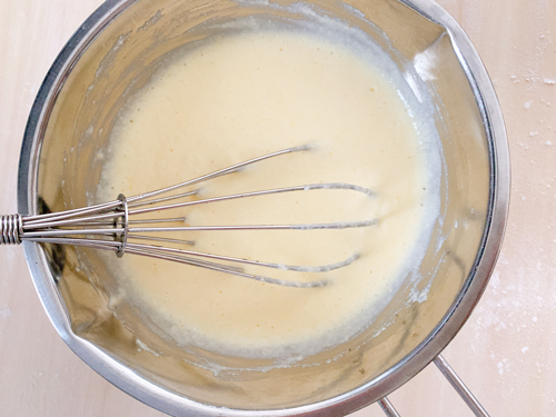 カスタードパウダーに牛乳を加え泡だて器で良く混ぜる。さつまいもは大きい物はいちょう切りに、小さい物は半月に切る。