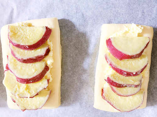 カスタードクリームをのせ、その上にさつまいもを並べ、少し上から押す。