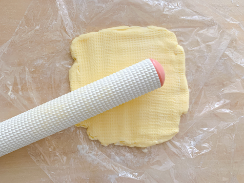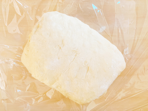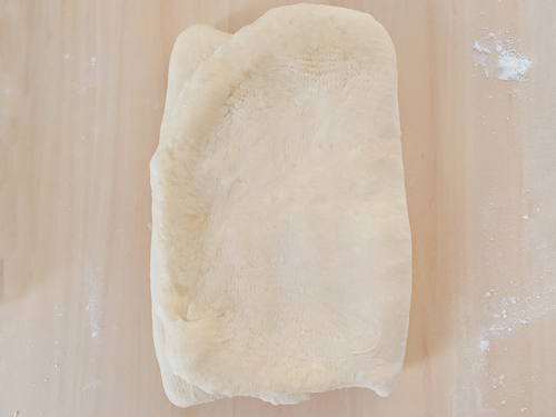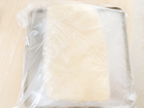 打ち粉をし、生地を取り出しガスを抜き、三つ折にしてラップに包み、冷凍庫で5分休ませる。