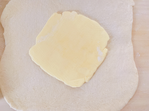 バターを取り出し粉を振り麺棒で生地の硬さと合わせる生地を25cm四方に広げ折込バターを斜めにのせる。