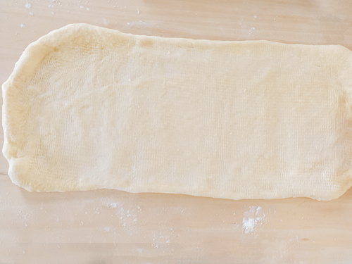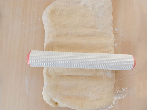 台に打ち粉を広げ、生地を置き、バターと生地がなじむように上から麺棒で全体を押し付ける。