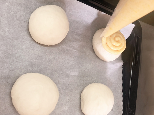 丸め直し、天板にオーブンペーパーを敷き間隔をあけて並べる。乾燥しないように、濡れ布巾を掛け、ビニール袋で包み、暖かいところで2次発酵30分。