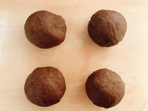 生地を4等分する。はりを持たせるように丸める。濡れ布巾を掛け、全体をビニール袋で覆い10分ほど休ませる。