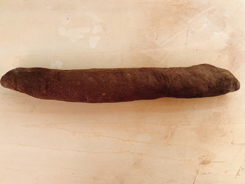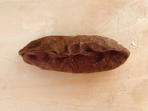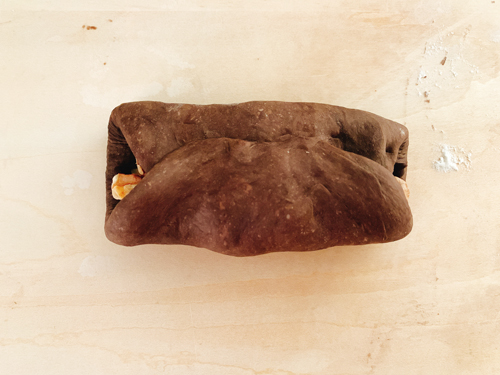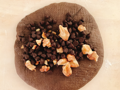 成形する。手で軽くつぶし、麺棒で伸ばしてチョコチップ&くるみをのせる。空気が入らないように三つ折にし、両端を付ける。