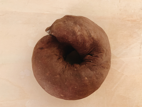 転がして、棒状にしたら、輪にして、上にある端を下外側に伸ばしながら生地をあわせる。