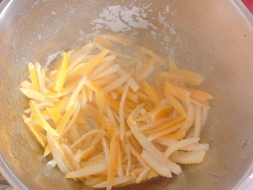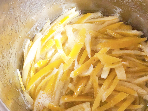皮の分量の半量のグラニュー糖と皮を小鍋に入れて水分が飛ぶまで煮詰める。