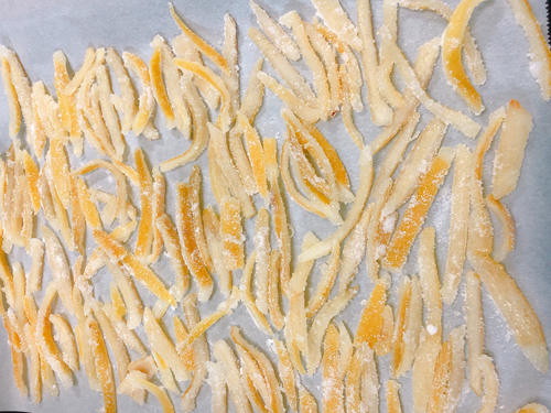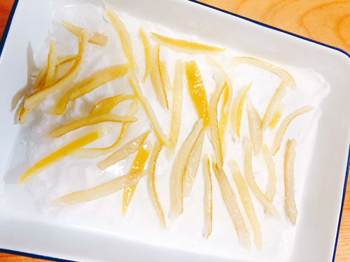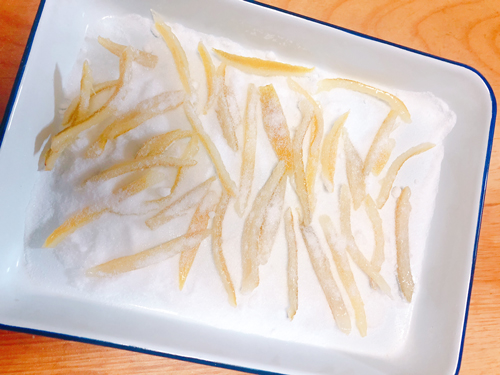 バットにグラニュー糖をしき、その上に皮をおき、グラニュー糖をまぶす。