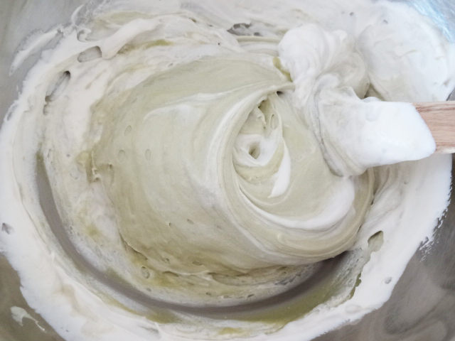 別のボウルに生クリームとグラニュー糖を入れ角が立つまで泡立てる10のクリームに生クリームを加えゴムベラでマーブル状になるまで混ぜる。
