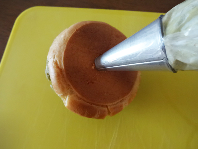 丸口金をつけた絞り袋にクリームを入れる。シューの底に穴をあけ、クリームを55g絞る。冷蔵庫でよく冷やす。