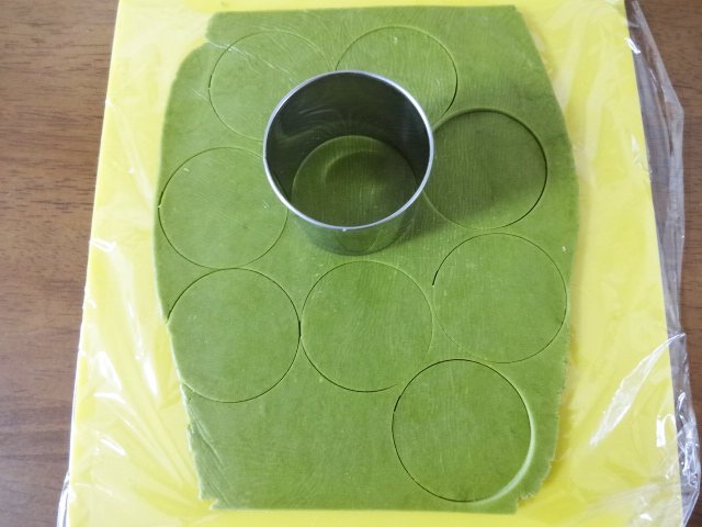ひとつにまとめ、3mm厚さにのばして、冷蔵庫で1時間休ませてから5cm丸型で8枚抜いておく。冷凍庫で冷やし固めておく。