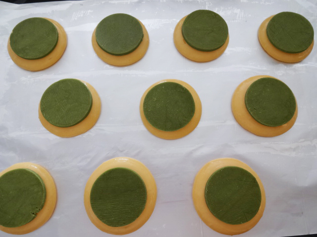 丸口金をつけた絞り袋に生地を入れ、バターを塗ったアルミホイルに直径5cmに約8ケ絞る。冷やしておいたクッキー生地をのせ190℃のオーブンで10分170℃に下げて20分焼く。