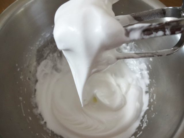 ボウルに卵白を入れグラニュー糖少量を加えてハンドミキサーで泡立てる。泡がたくさんたってきたら残りのグラニュー糖を2回に分けて加え泡立てる。