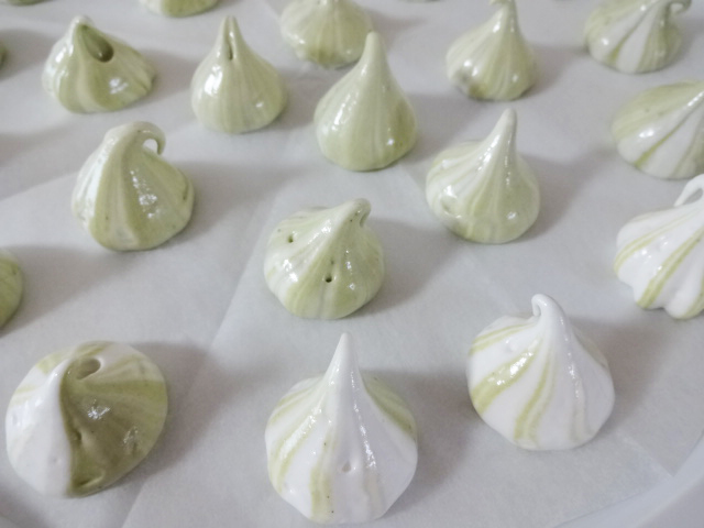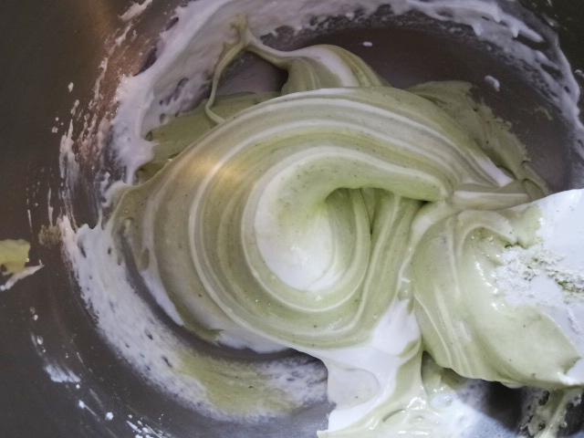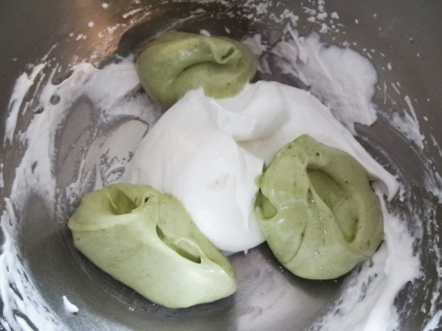 4のボウルに抹茶メレンゲを3か所に分けておく。ゴムベラで2~3回すくい混ぜる。※ほとんど混ざっていなくてよい。