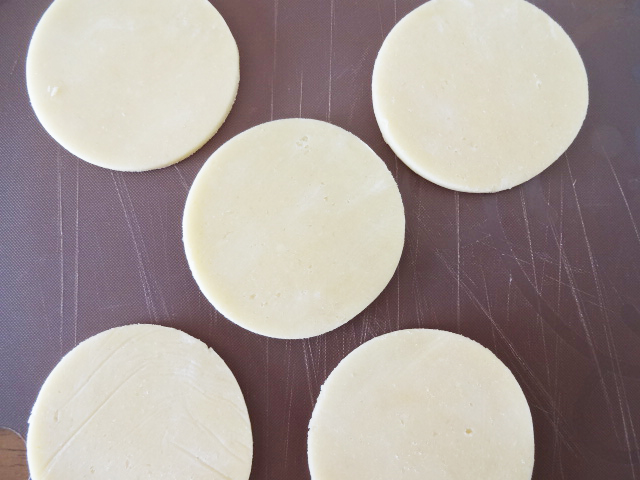 2mm厚さにのばし型よりひとまわり大きな丸型で10枚抜く。タルトレット型に敷き込み、フォークで穴をあけておく。冷蔵庫で1時間休ませる。