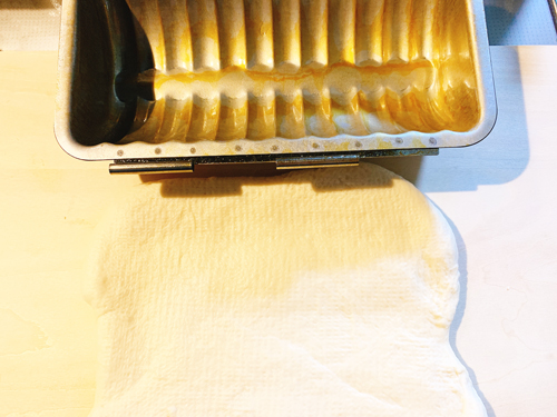 焼きあがったら焼き縮みを防ぐため型をタオルを敷いたところへ落として衝撃を与える。