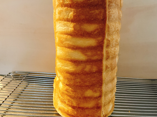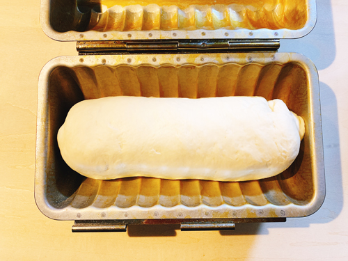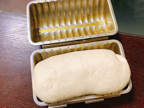 油を塗った型に生地を入れ2次発酵。片側の型からはみ出すくらいになるまで。