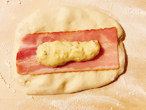 生地を指で平らにし、ベーコン、タルタルソースをのせる。