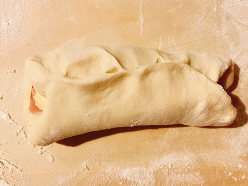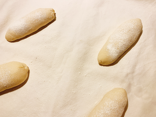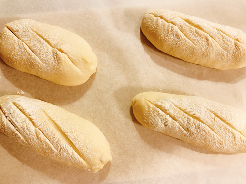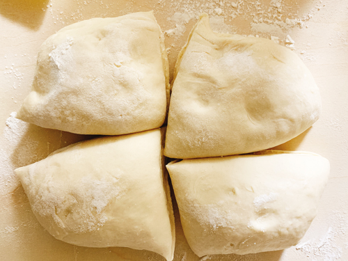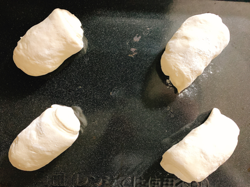 生地を4等分して、三つ折にして天板に並べる。ビニール袋で包み、ベンチタイム30分。