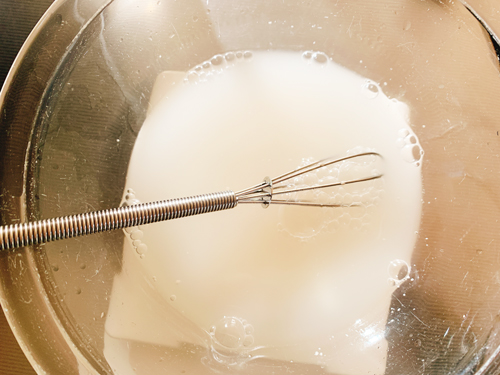 モルトパウダーを0.3g計る。電子秤にボウルをのせ、ホイッパーものせ、0にする。計ったモルトパウダーをボウルに入れる。