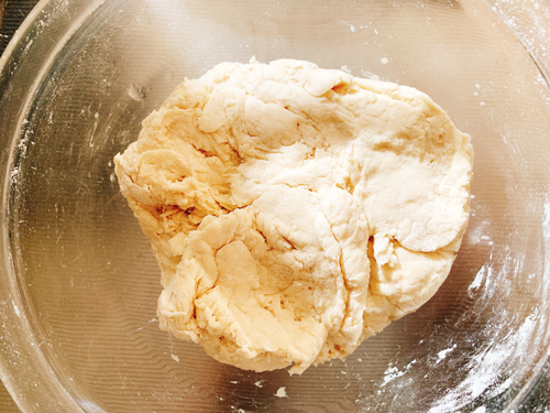 上から茶漉しで粉を振りスケッパーで周りをはがし、ボウルを逆さにして、台に生地を出す。