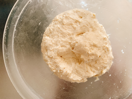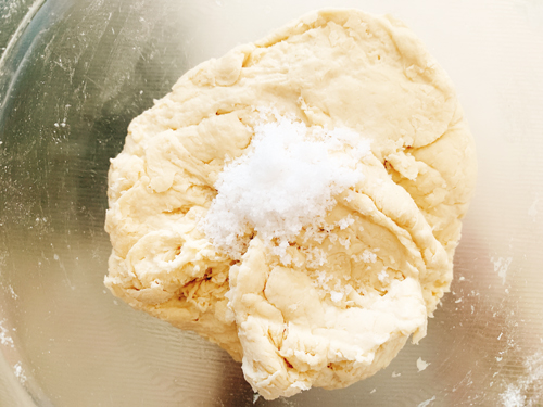 分量の塩を入れ、周りから畳むように混ぜる。70回ほど。ラップをして、30分休ませる。