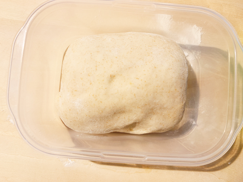 台に打ち粉をし、ガスを抜く。縦横に三つ折りして密閉容器に入れる。冷蔵庫で30分ほど生地を休ませる。