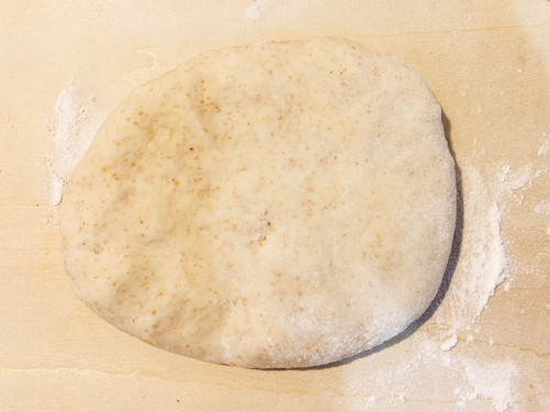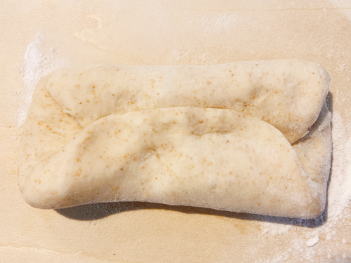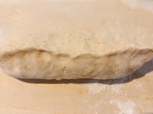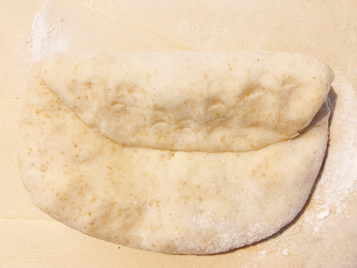 台に打ち粉をし、再度ガスを抜き、手で平たくする。生地の上半分をたたみ、下半分もたたむ。