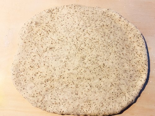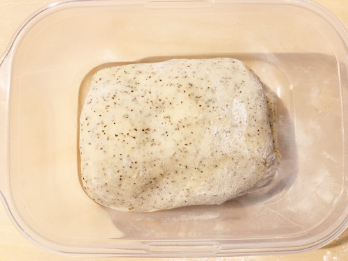 手粉をし、ガスを抜く。縦横三つ折にして密閉容器に入れ、冷蔵庫の野菜室で30分ほど休ませる。