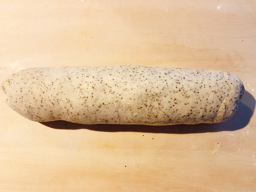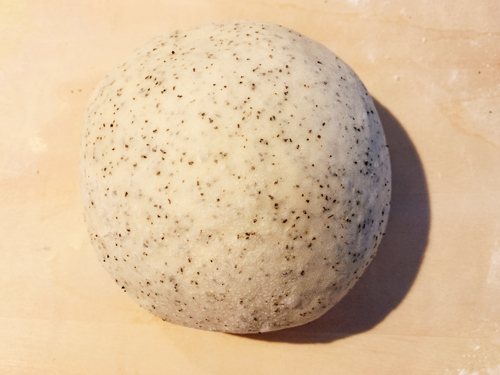 粉を振り、台にあけ、丸める。濡れ布巾を掛けベンチタイム15分。
