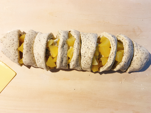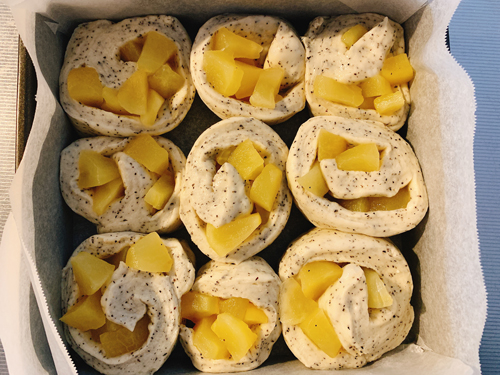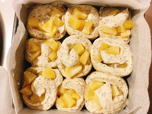 型に写真のように並べ、全体をビニール袋に入れ、2次発酵1時間ほど。照り出し用の牛乳を刷毛で塗る。