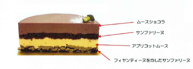 17の上にアプリコットムースを40g充填し、フィヤンティーヌを均したサンファリーヌで蓋をし冷凍する