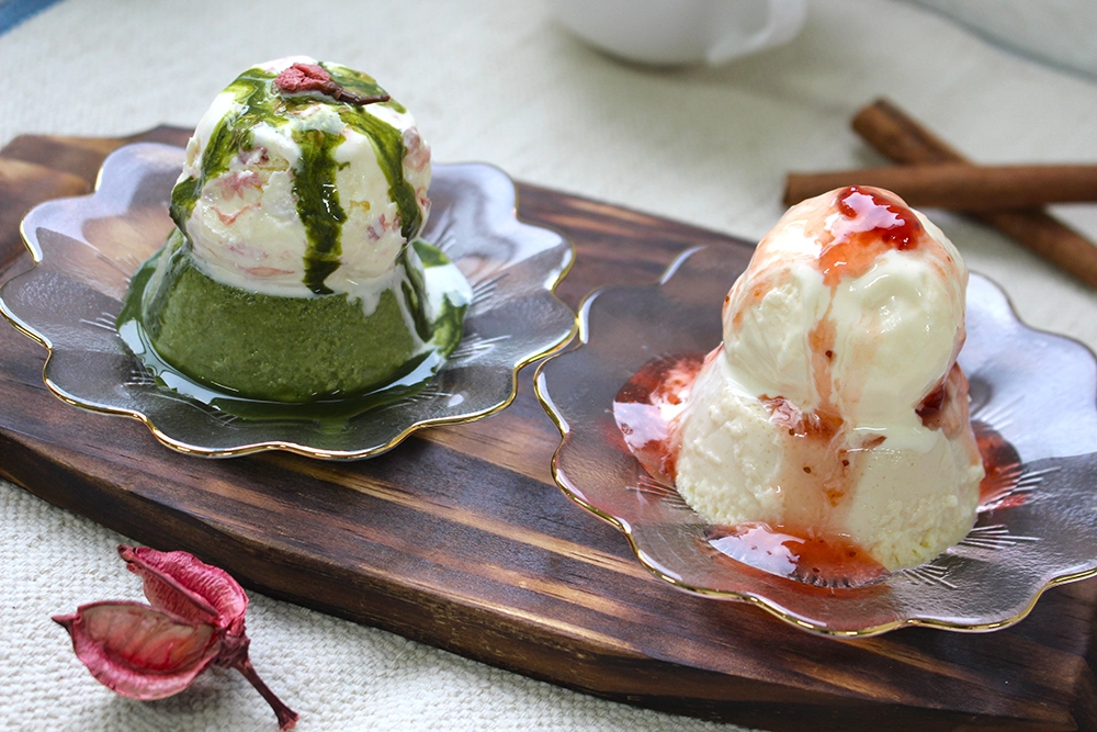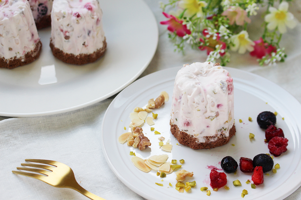 アイスクリームより軽い口当たりで、キャラメリゼしたナッツの香ばしさや、ラムレーズンの香りがちょっと大人の味わいに。綺麗に盛ればコース料理のデザートにもなるのでお店の一品にもいかがでしょうか♪